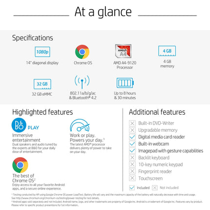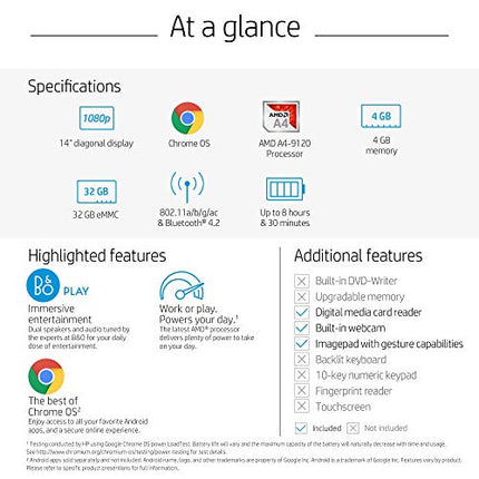 HP Chromebook 14-inch Laptop with 180-Degree Hinge, Full HD Screen, AMD Dual-Core A4-9120 Processor, 4 GB SDRAM, 32 GB eMMC Storage, Chrome OS (14-db0050nr, Snow White) (Renewed)